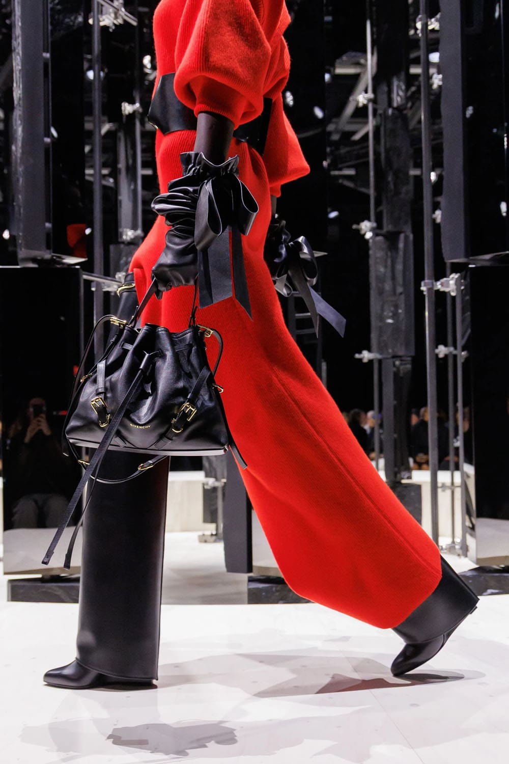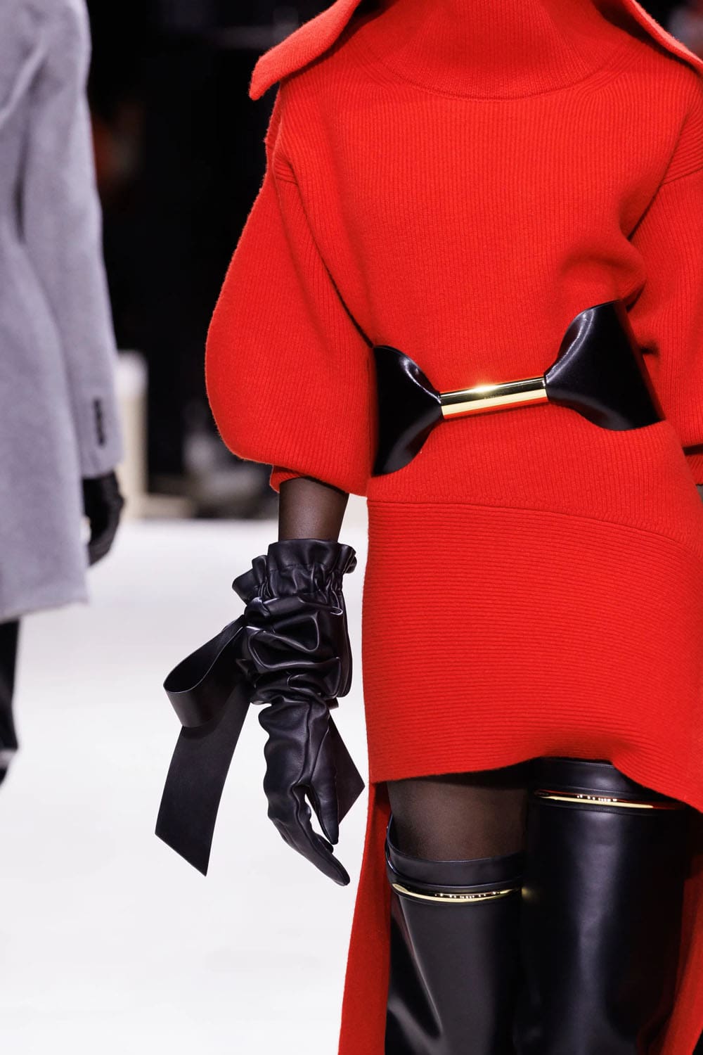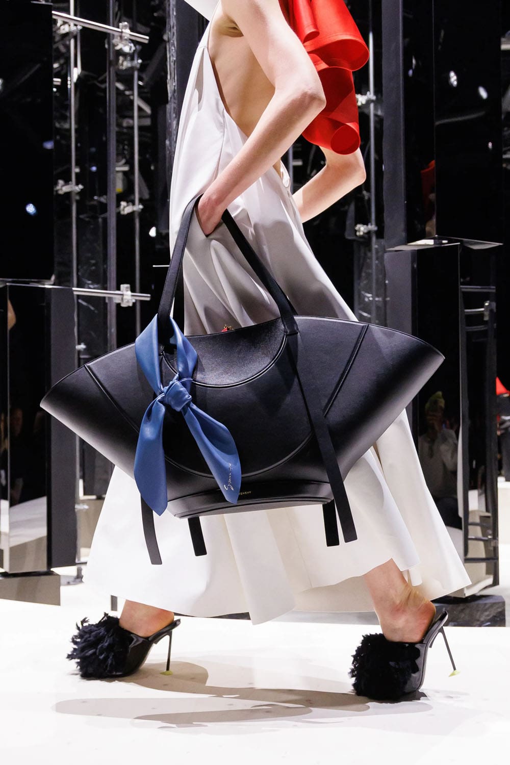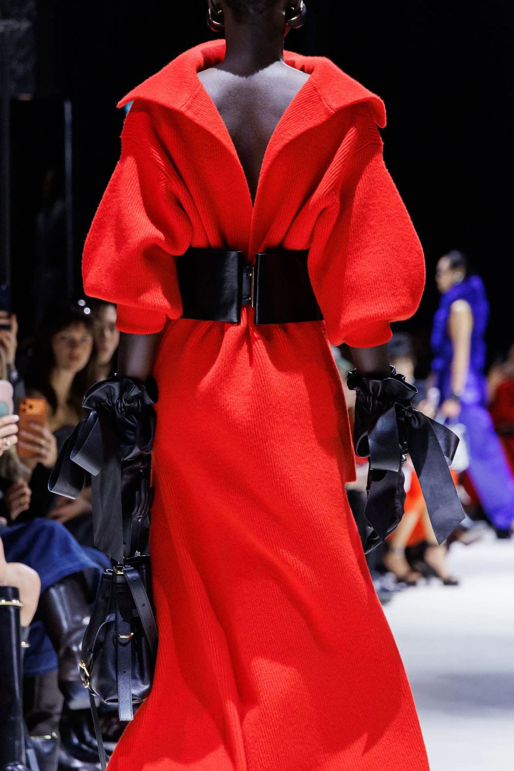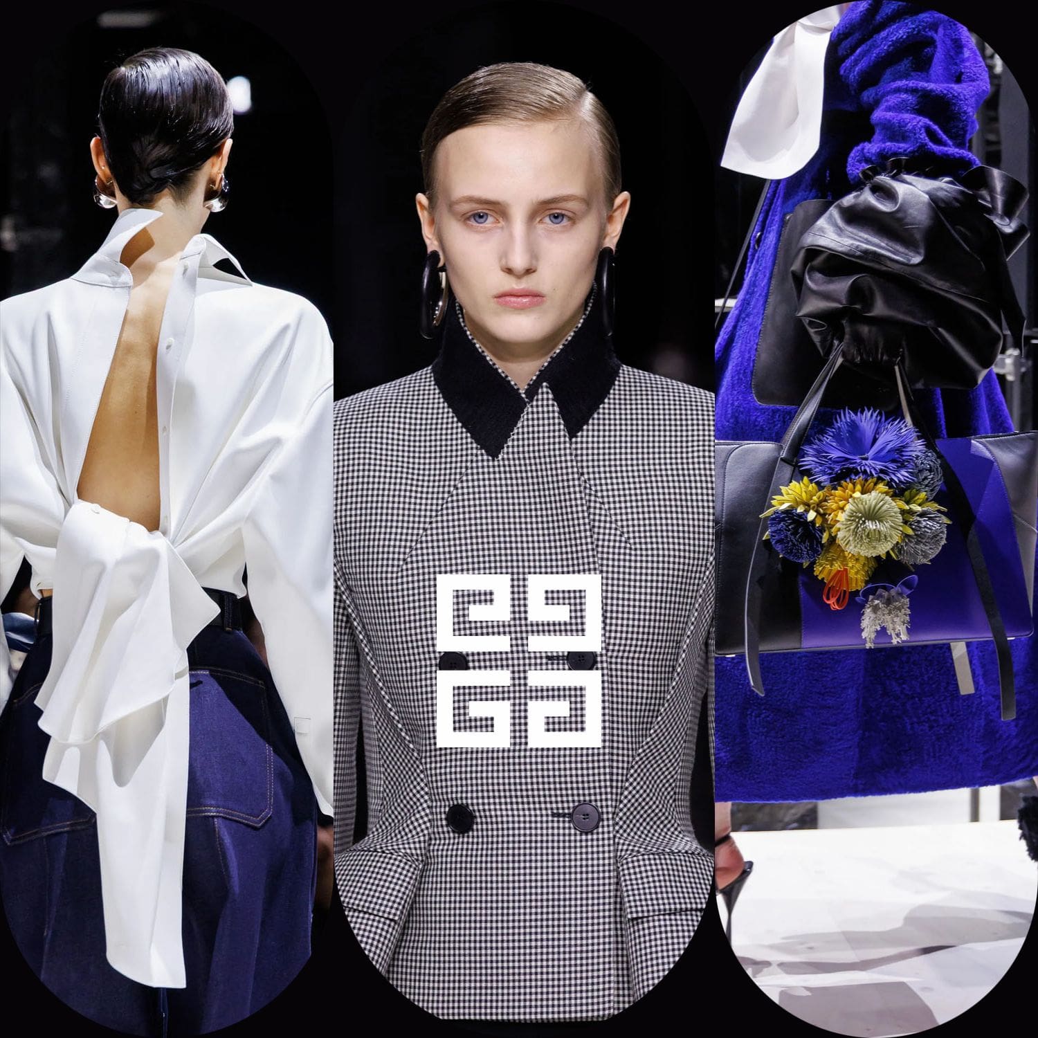 E poi, naturalmente, gli accessori: i sontuosi guanti di pelle, annodati e stretti come sculture in miniatura; le borse dalla struttura netta da cui spuntano bouquet surreali; gli orecchini circolari che riecheggiano l'età d'oro di Givenchy.