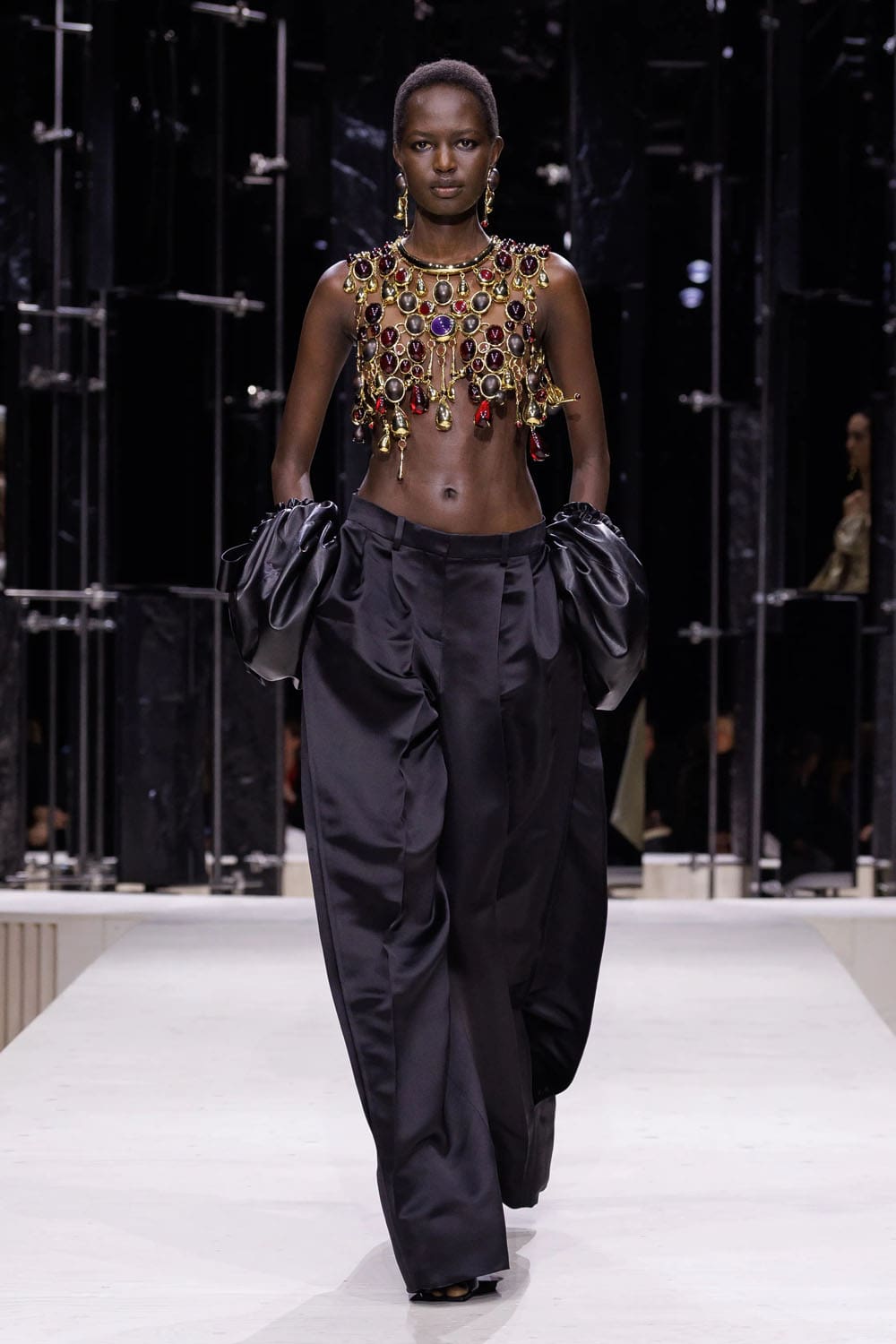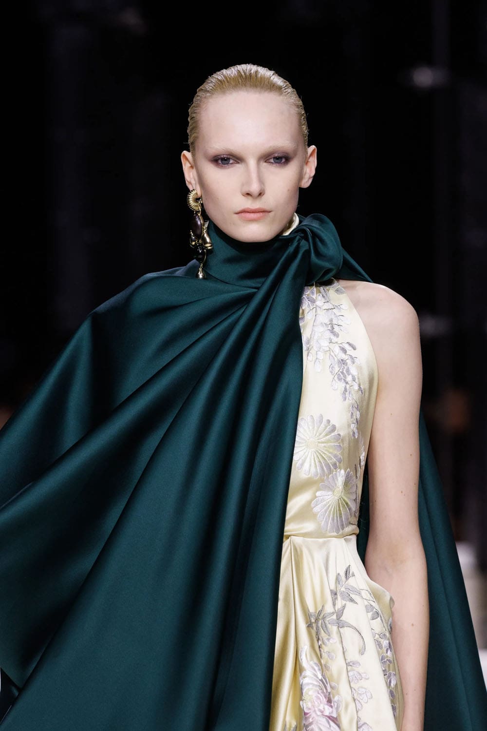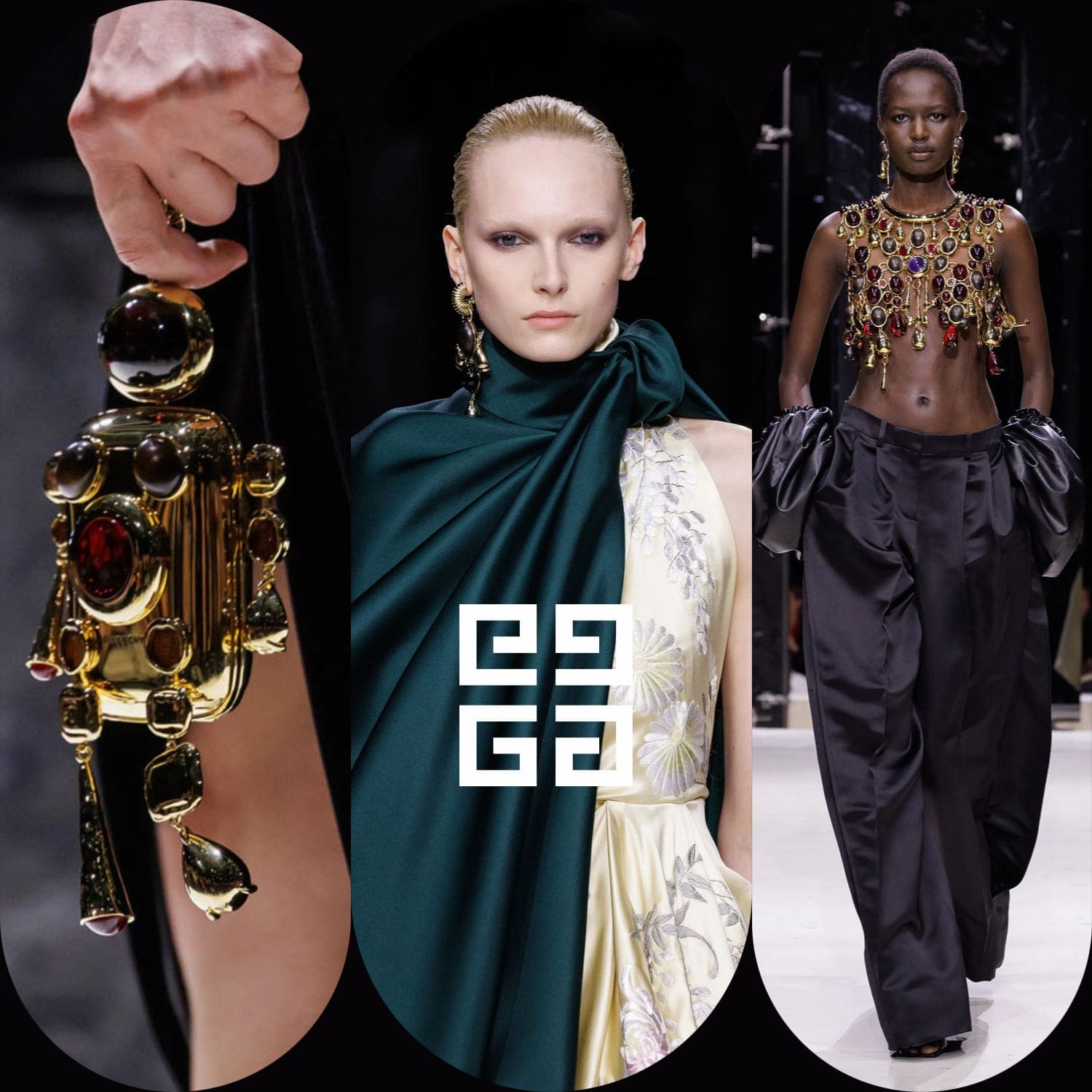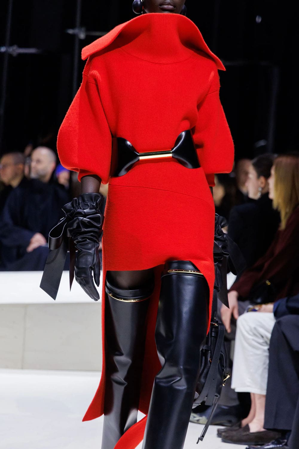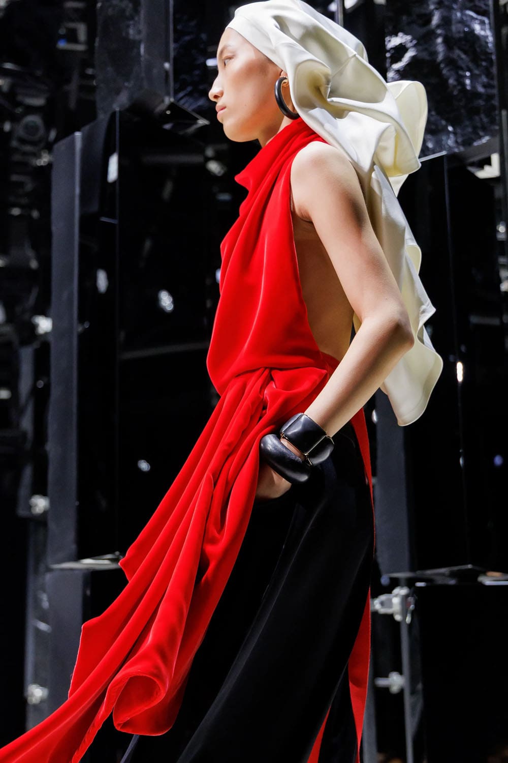 E poi, naturalmente, gli accessori: i sontuosi guanti di pelle, annodati e stretti come sculture in miniatura; le borse dalla struttura netta da cui spuntano bouquet surreali; gli orecchini circolari che riecheggiano l'età d'oro di Givenchy.