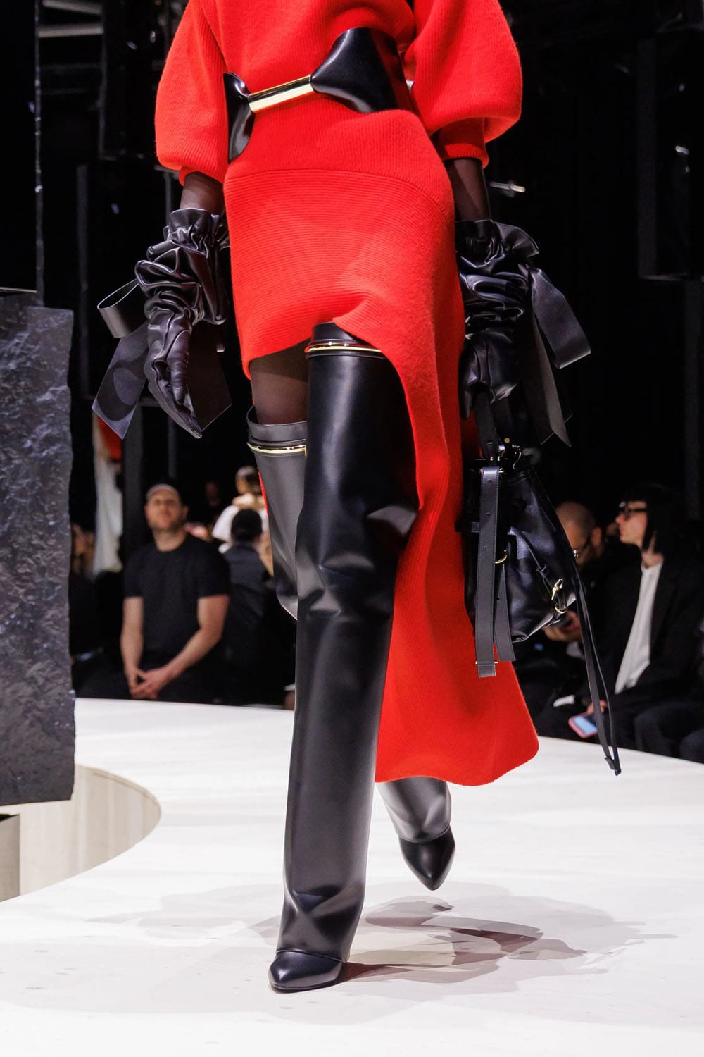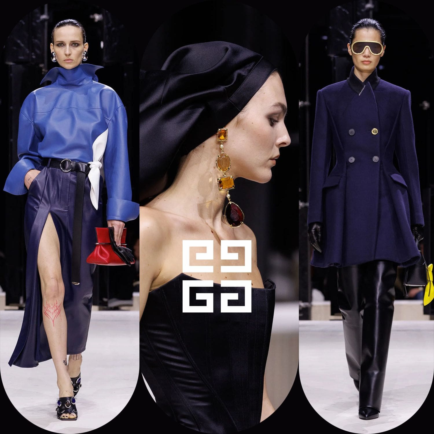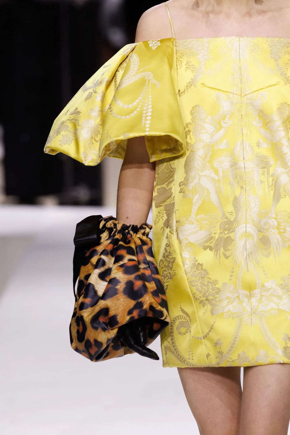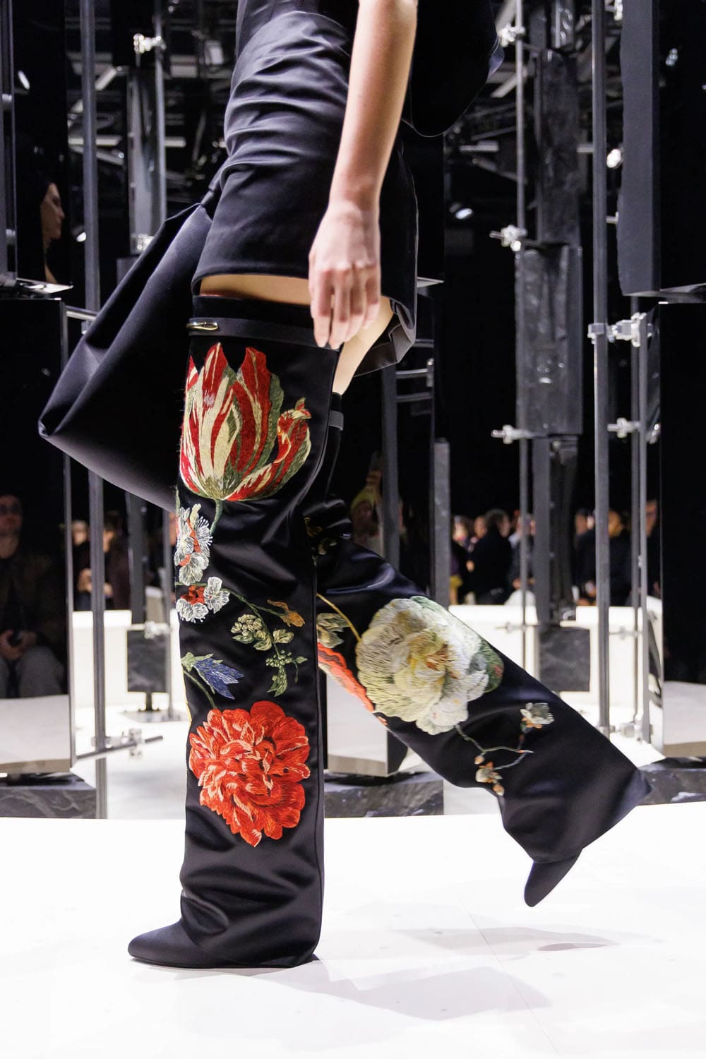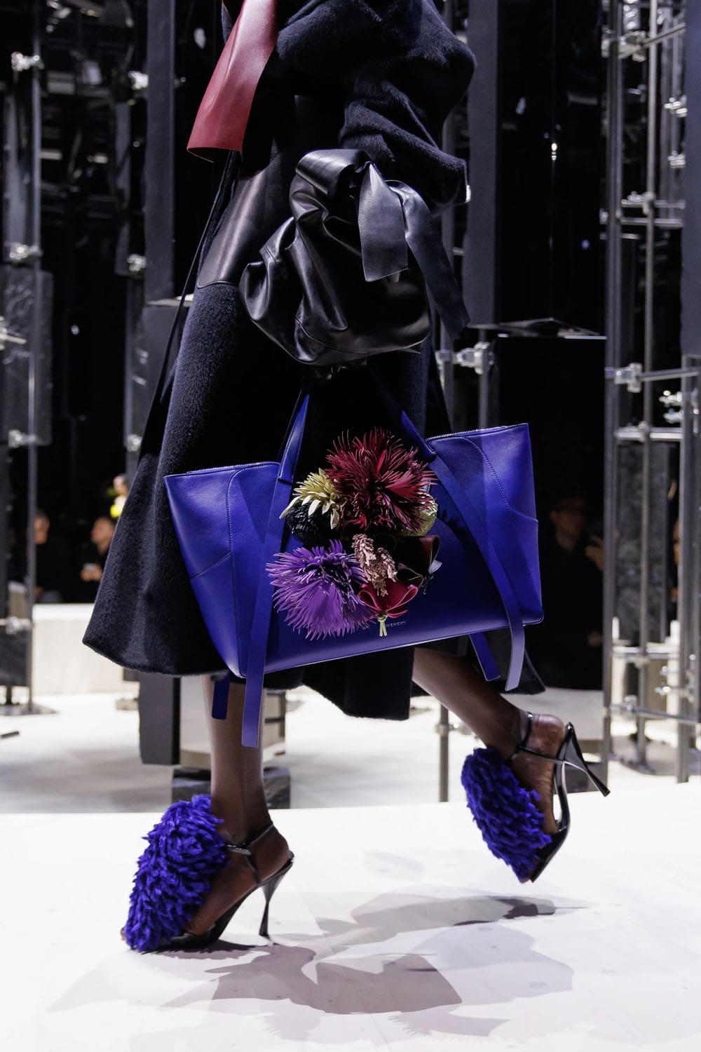 E poi, naturalmente, gli accessori: i sontuosi guanti di pelle, annodati e stretti come sculture in miniatura; le borse dalla struttura netta da cui spuntano bouquet surreali; gli orecchini circolari che riecheggiano l'età d'oro di Givenchy.