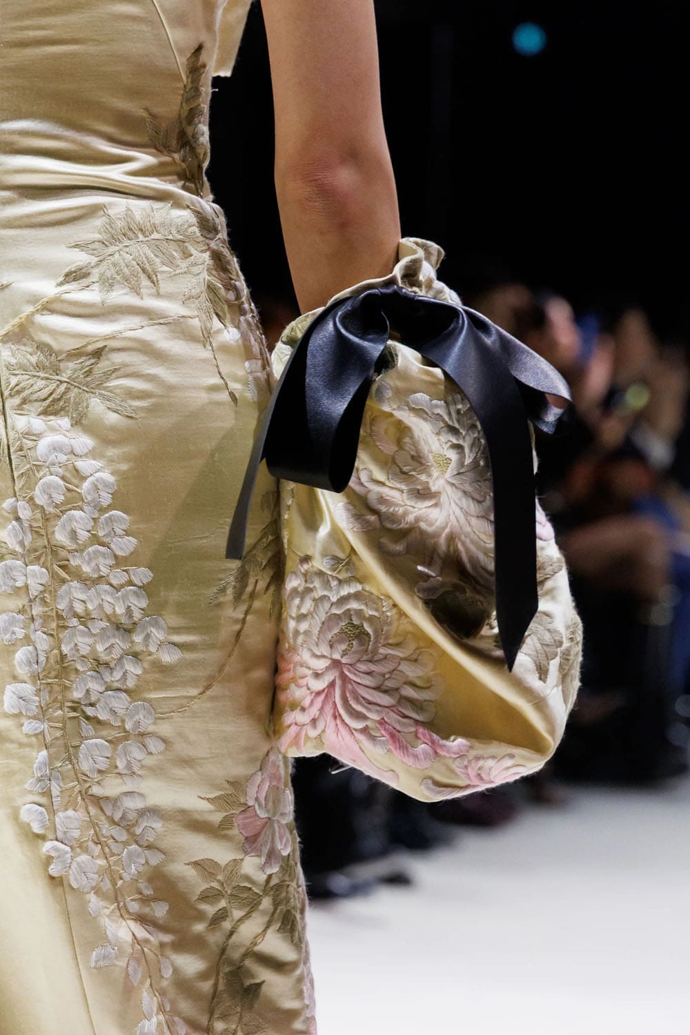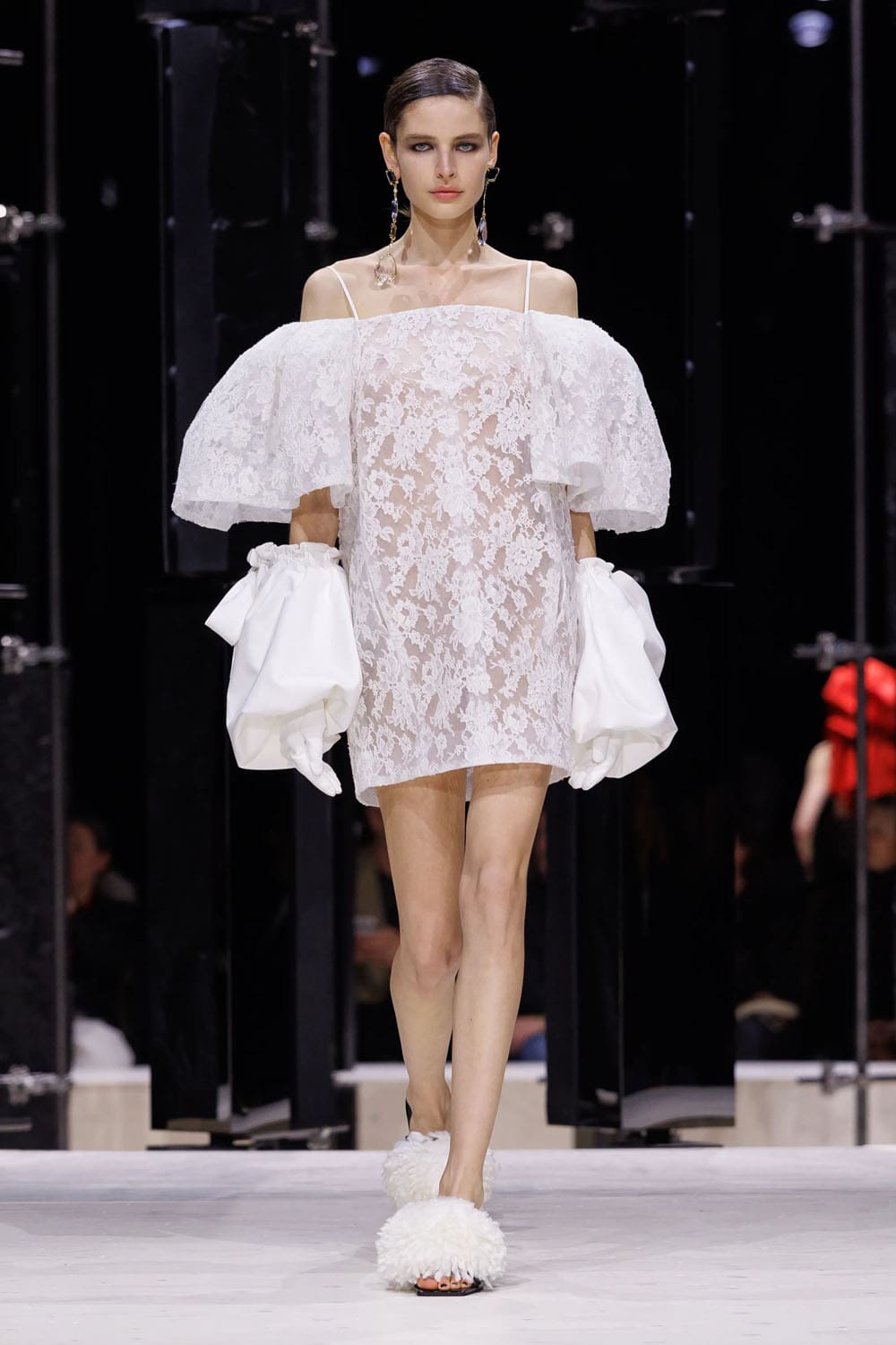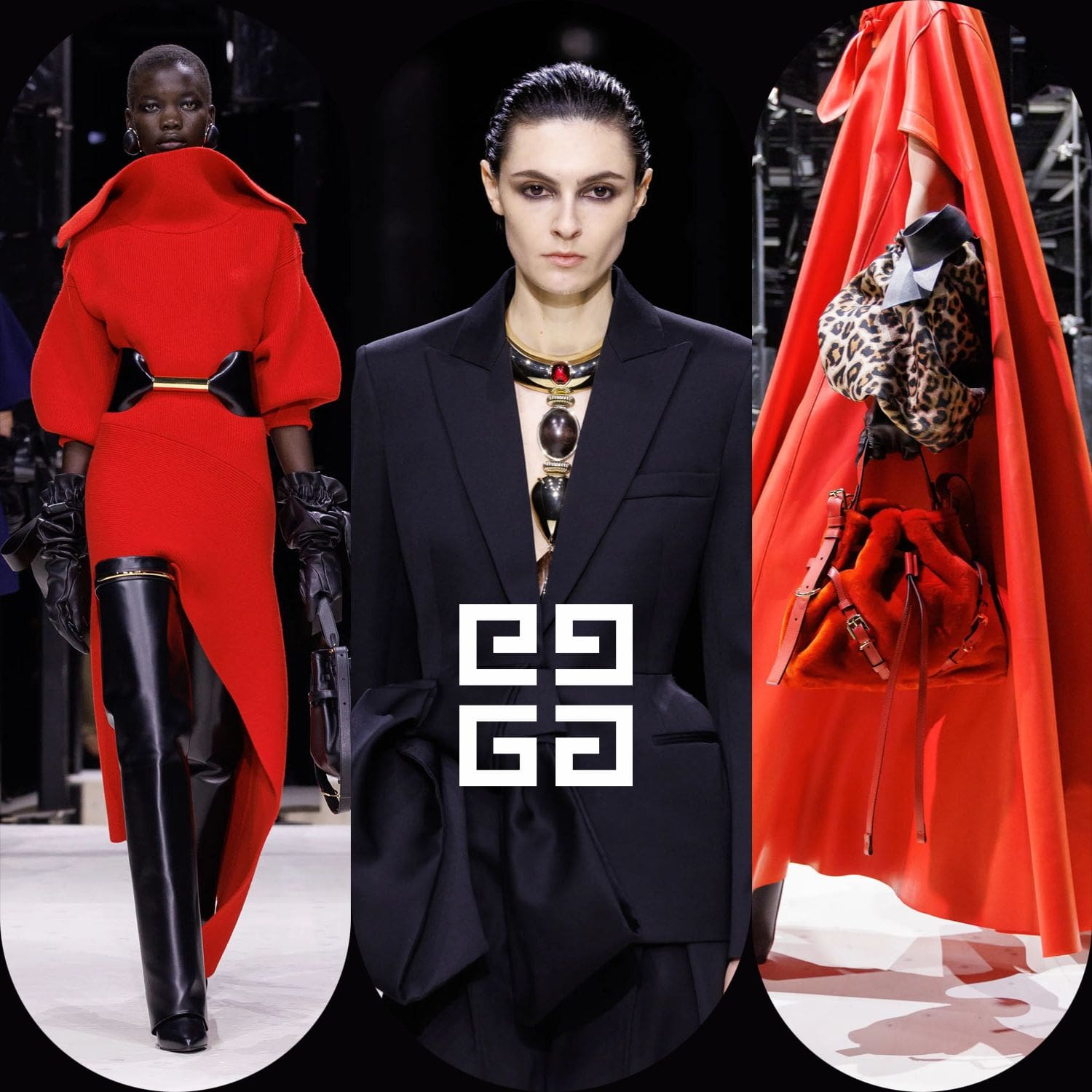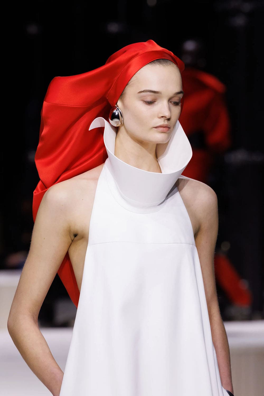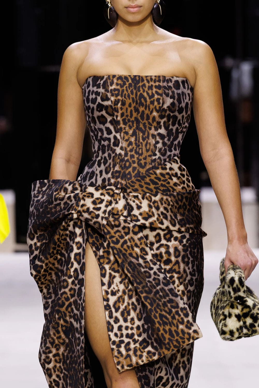 E poi, naturalmente, gli accessori: i sontuosi guanti di pelle, annodati e stretti come sculture in miniatura; le borse dalla struttura netta da cui spuntano bouquet surreali; gli orecchini circolari che riecheggiano l'età d'oro di Givenchy.