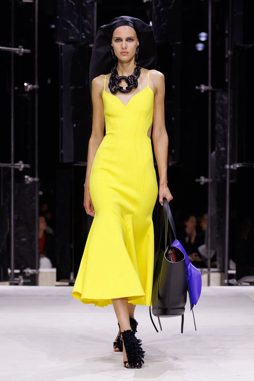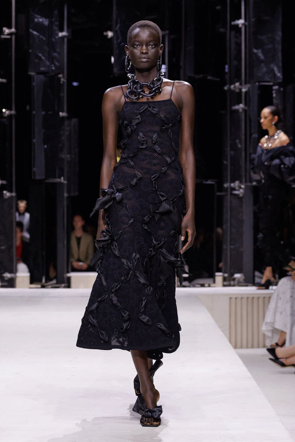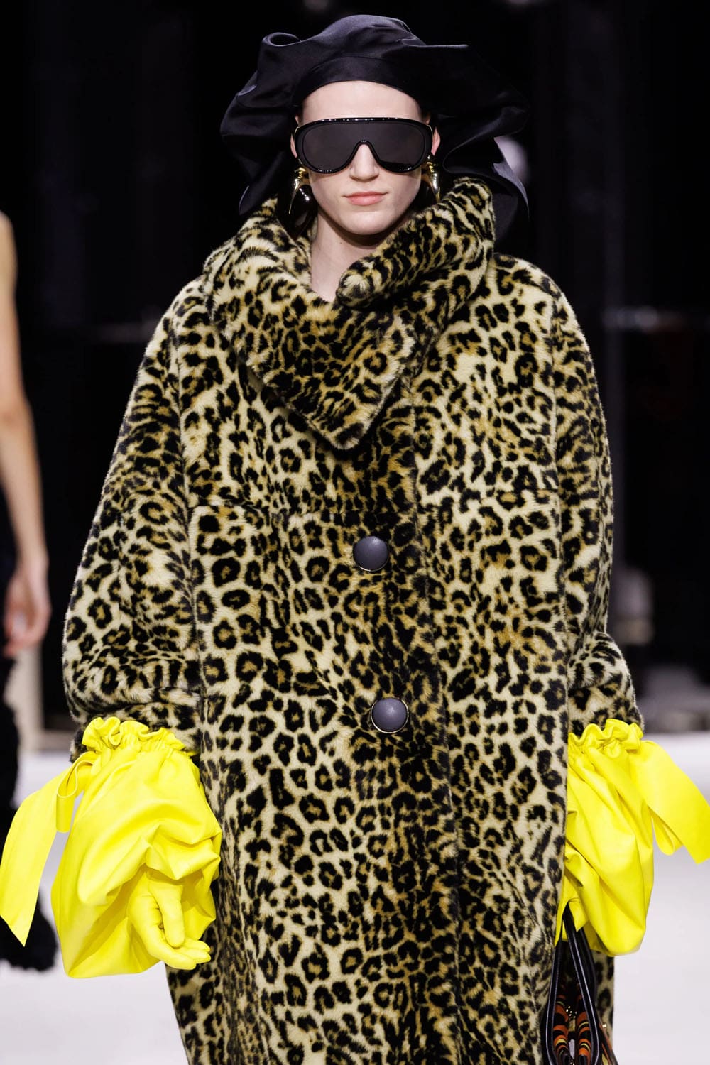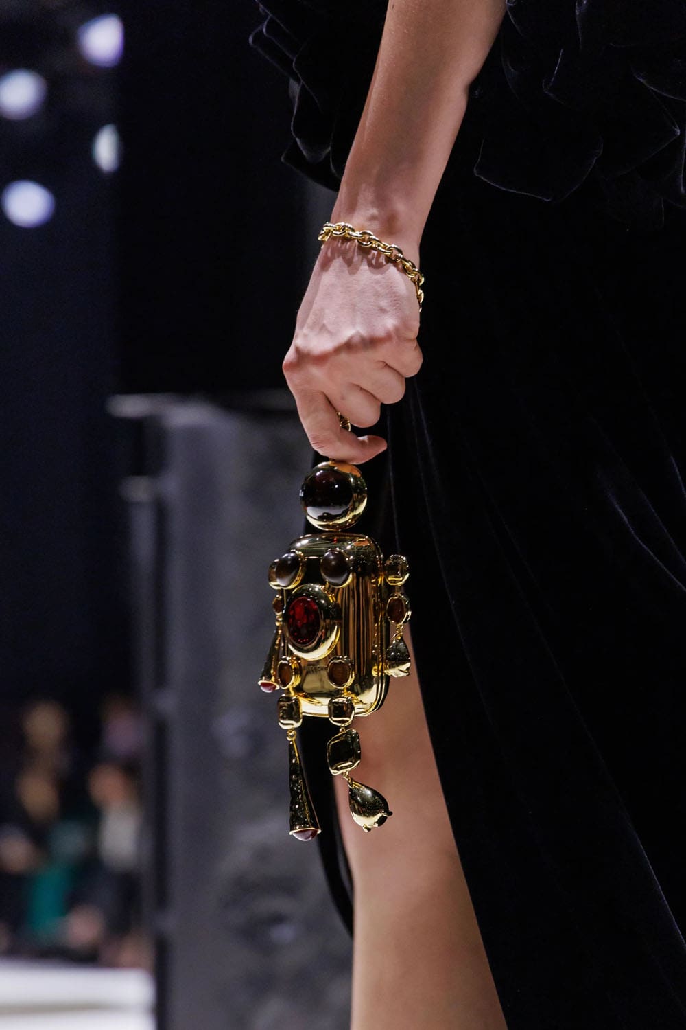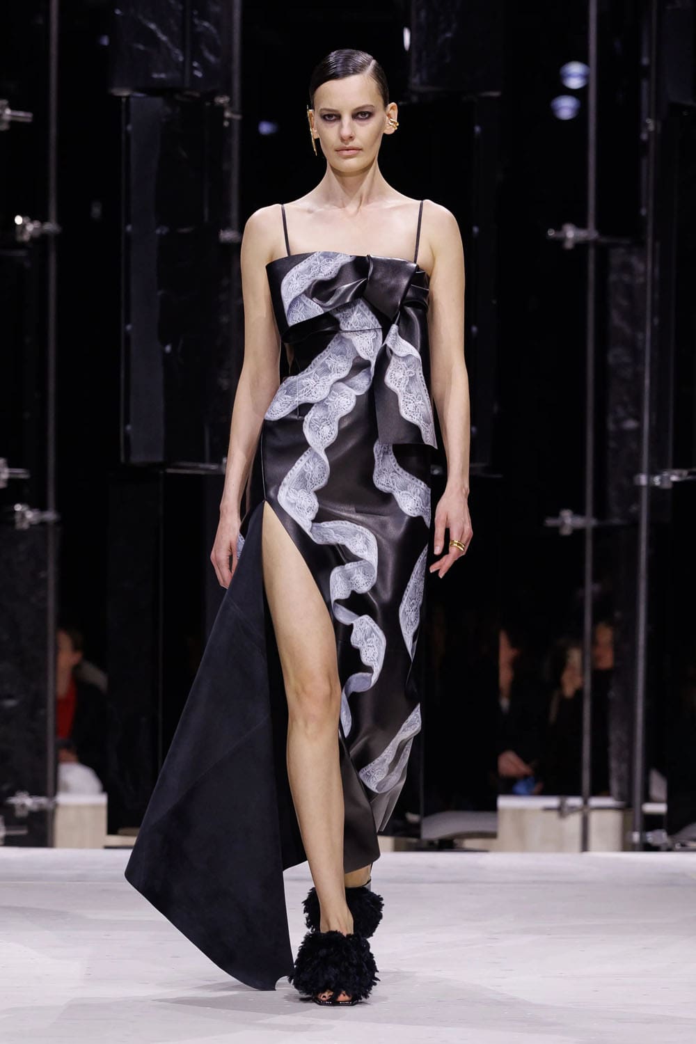 E poi, naturalmente, gli accessori: i sontuosi guanti di pelle, annodati e stretti come sculture in miniatura; le borse dalla struttura netta da cui spuntano bouquet surreali; gli orecchini circolari che riecheggiano l'età d'oro di Givenchy.