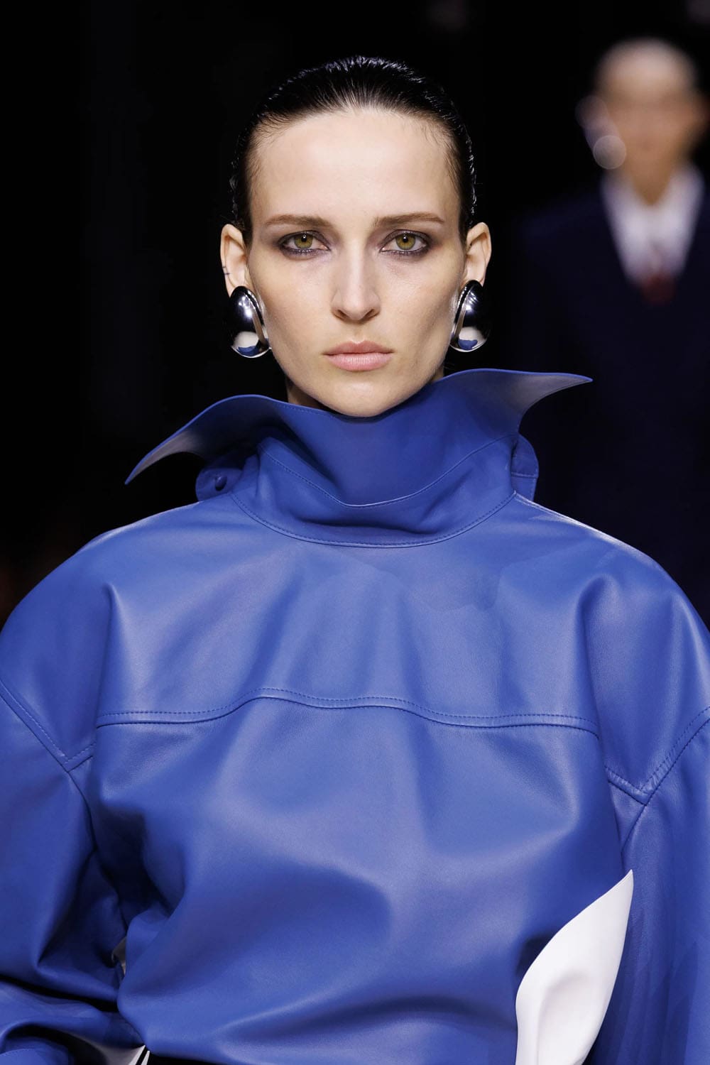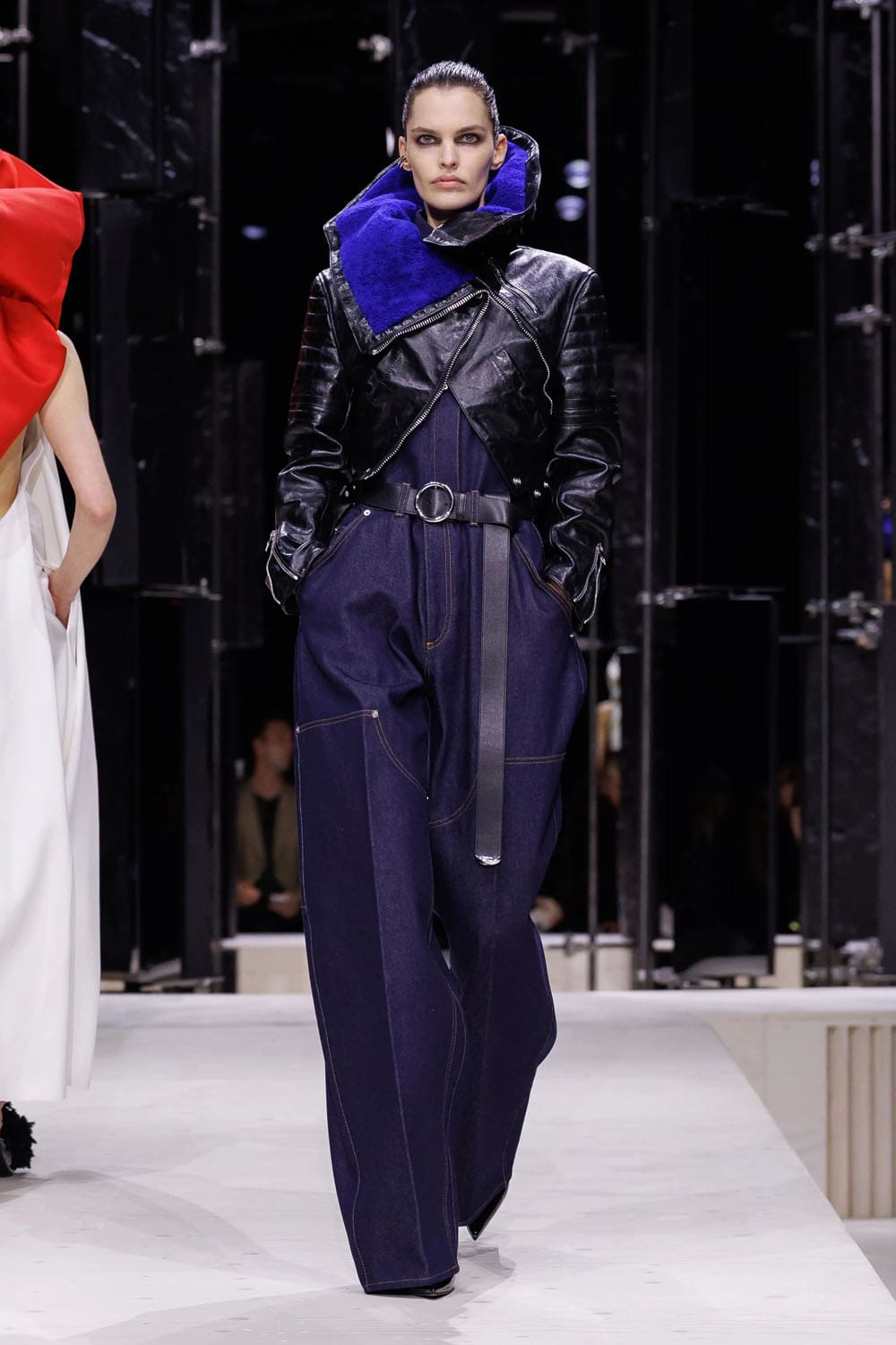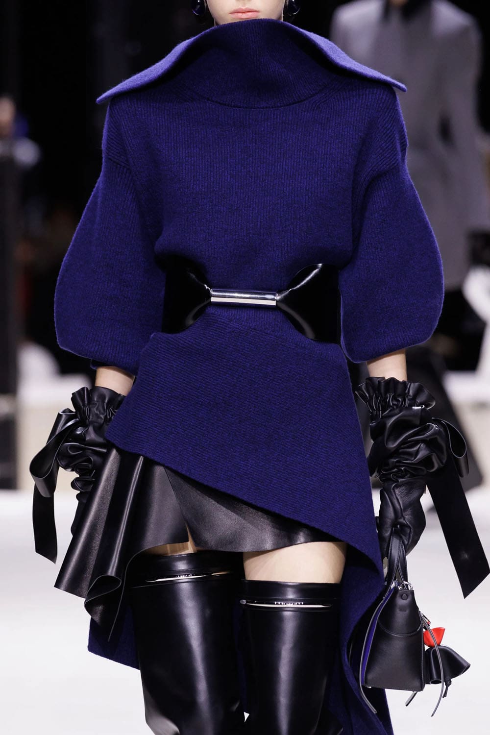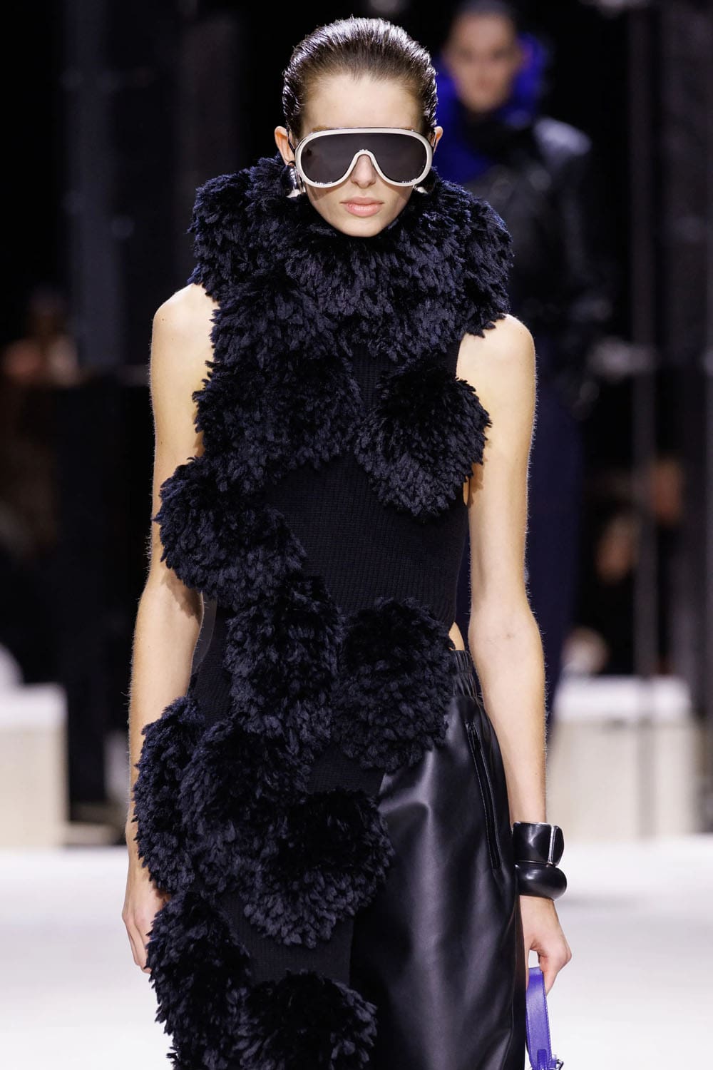 La sfilata si è aperta con uno studio sulla tensione: un cappotto blu navy scolpito, la cui asimmetria rivelava un top in pelle rosa-rosso intrecciato, indossato con la nonchalance di una donna consapevole che la drammaticità è più efficace quando è controllata. Guanti lussuosi, volutamente oversize e arricciati, iniettavano un tocco di perversità couture anni '1980, mentre le mules in shearling blu elettrico davano una scossa al consueto umorismo eccentrico di Burton.