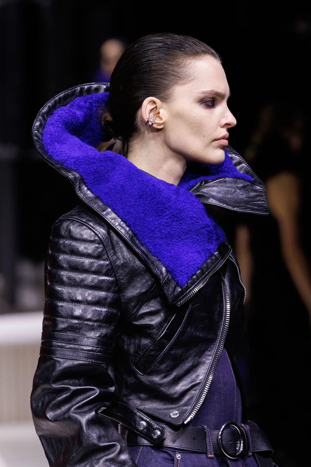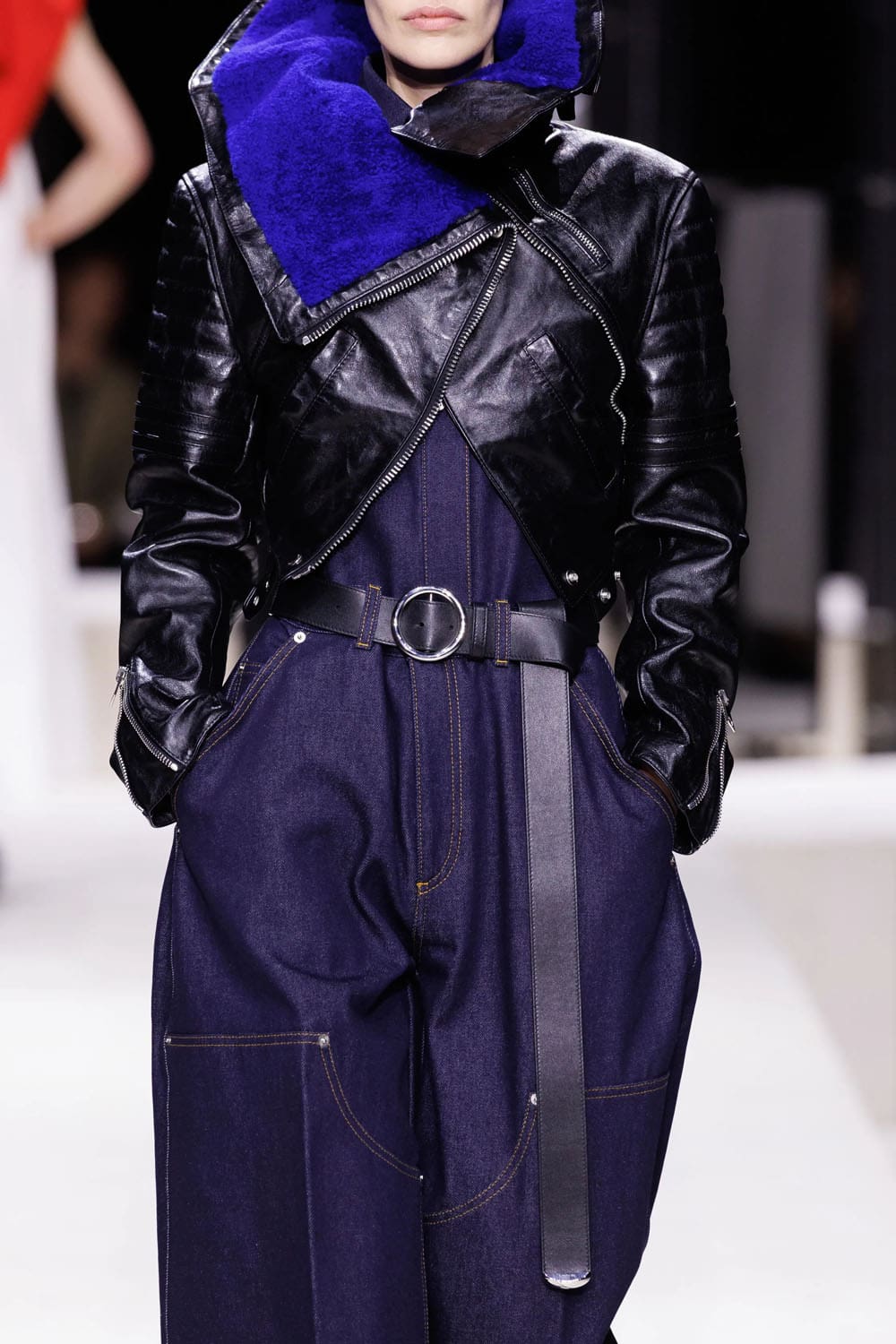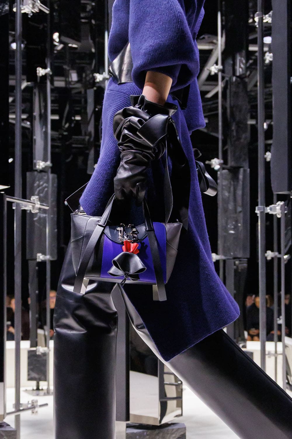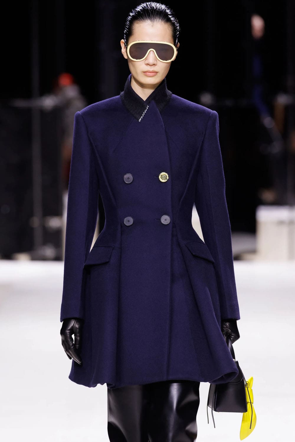 La sfilata si è aperta con uno studio sulla tensione: un cappotto blu navy scolpito, la cui asimmetria rivelava un top in pelle rosa-rosso intrecciato, indossato con la nonchalance di una donna consapevole che la drammaticità è più efficace quando è controllata. Guanti lussuosi, volutamente oversize e arricciati, iniettavano un tocco di perversità couture anni '1980, mentre le mules in shearling blu elettrico davano una scossa al consueto umorismo eccentrico di Burton.