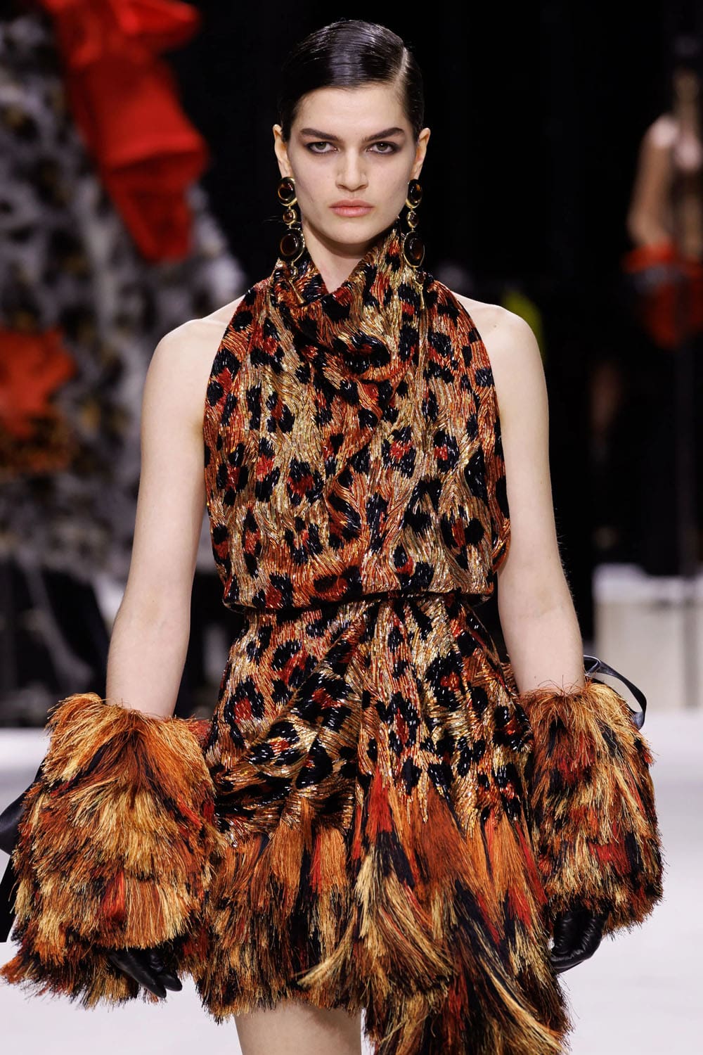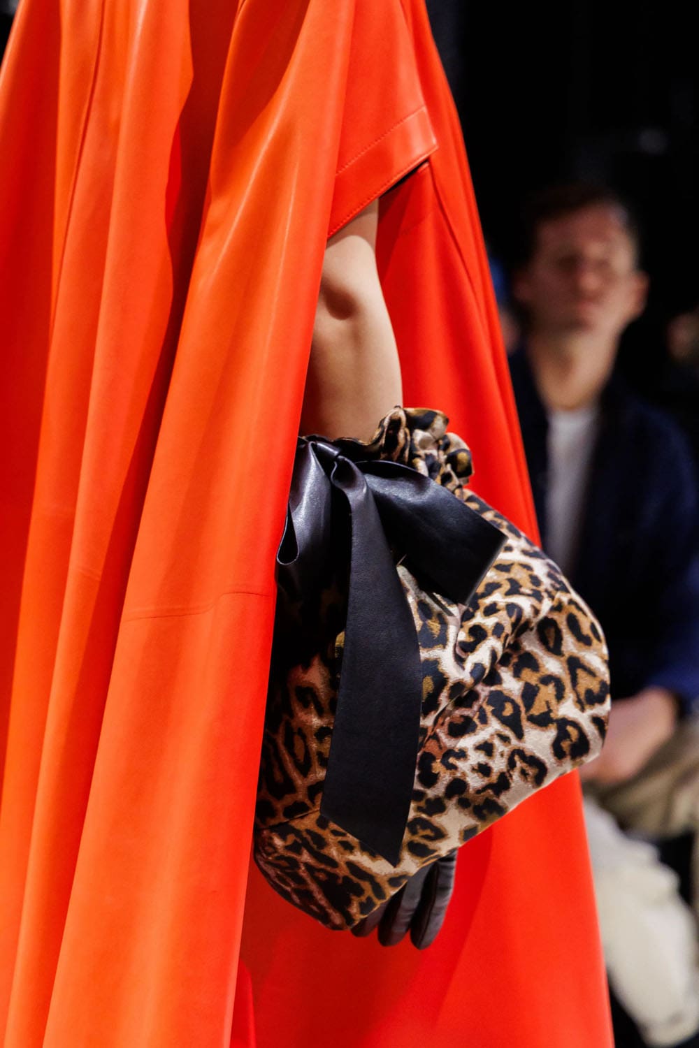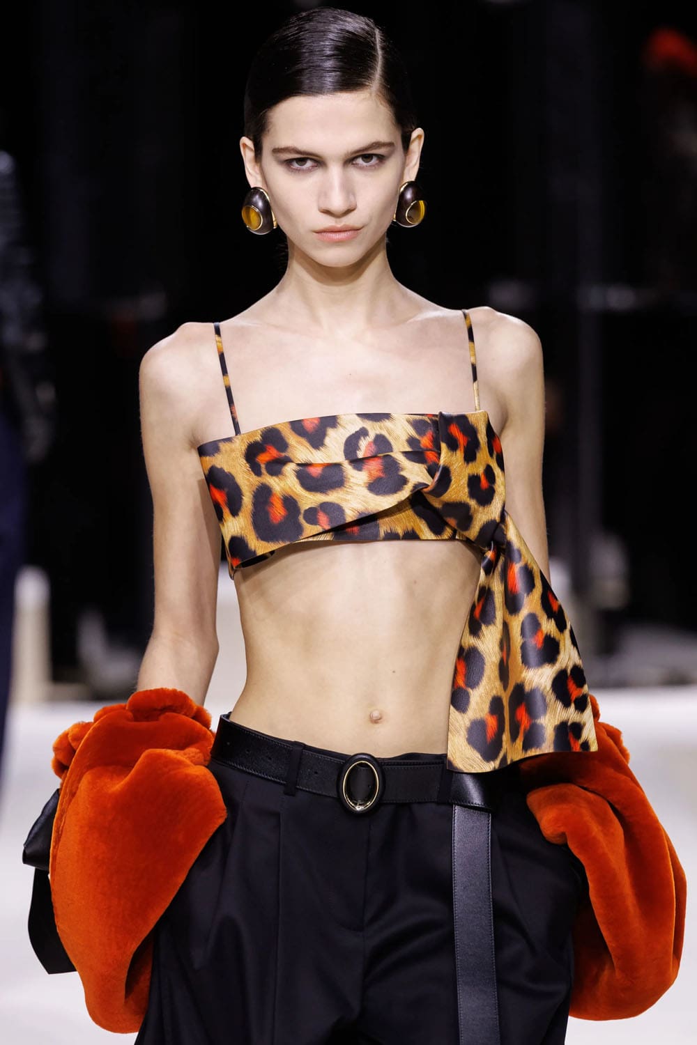 I capispalla, come previsto, fungevano da elemento di punteggiatura. Un gigantesco cappotto di shearling, tinto in tonalità leopardate, avvolgeva chi lo indossava in una tempesta di texture – un omaggio di Burton agli eccessi di fine anni '90, seppur ancorato alla sua precisione. Un altro momento ha visto protagonista una mantella di pelle arancione fusa, che copriva completamente il corpo, fatta eccezione per un lampo di guanti leopardati che spuntavano dagli spacchi – un moderno dramma Givenchy con il cuore pulsante del vecchio cinema.