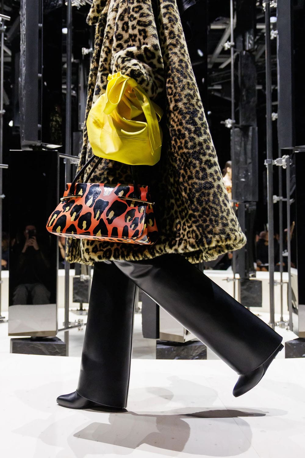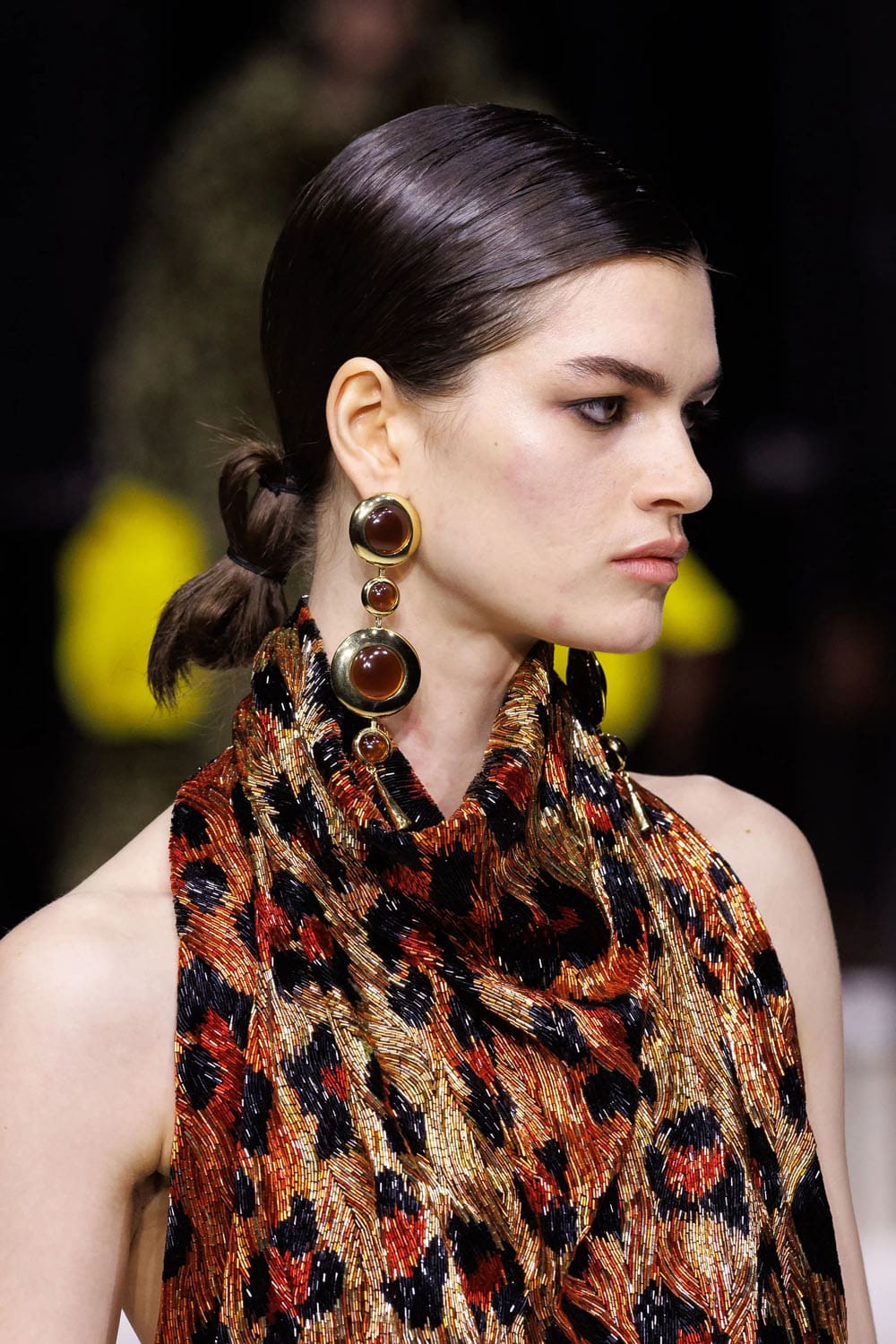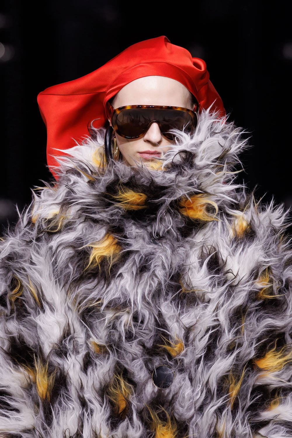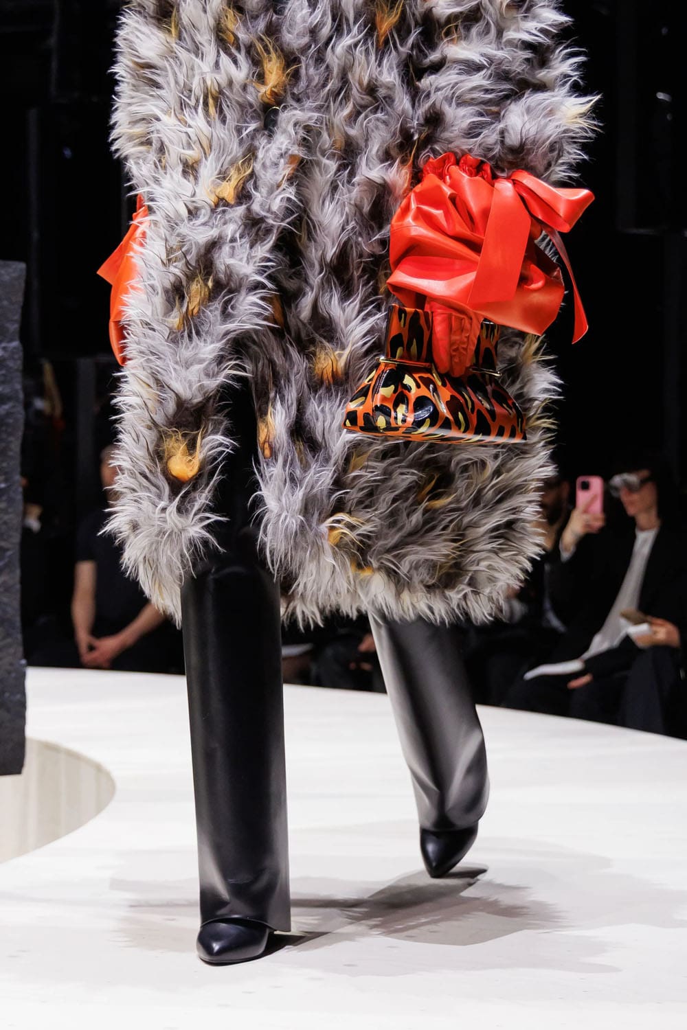 I capispalla, come previsto, fungevano da elemento di punteggiatura. Un gigantesco cappotto di shearling, tinto in tonalità leopardate, avvolgeva chi lo indossava in una tempesta di texture – un omaggio di Burton agli eccessi di fine anni '90, seppur ancorato alla sua precisione. Un altro momento ha visto protagonista una mantella di pelle arancione fusa, che copriva completamente il corpo, fatta eccezione per un lampo di guanti leopardati che spuntavano dagli spacchi – un moderno dramma Givenchy con il cuore pulsante del vecchio cinema.