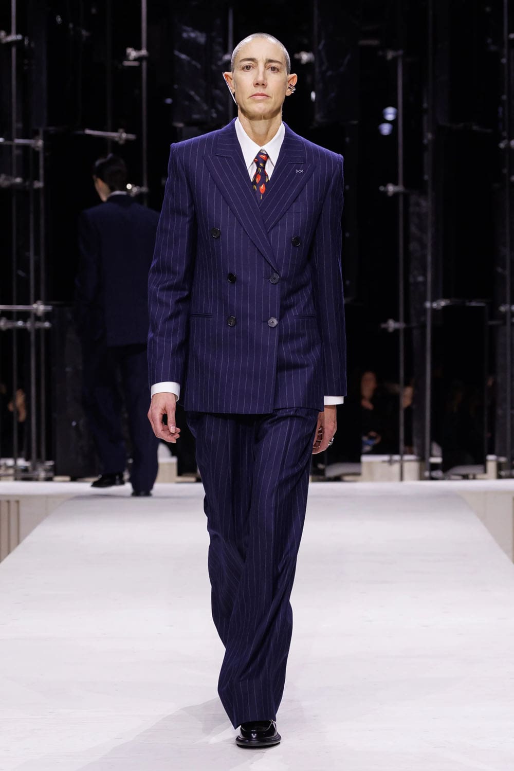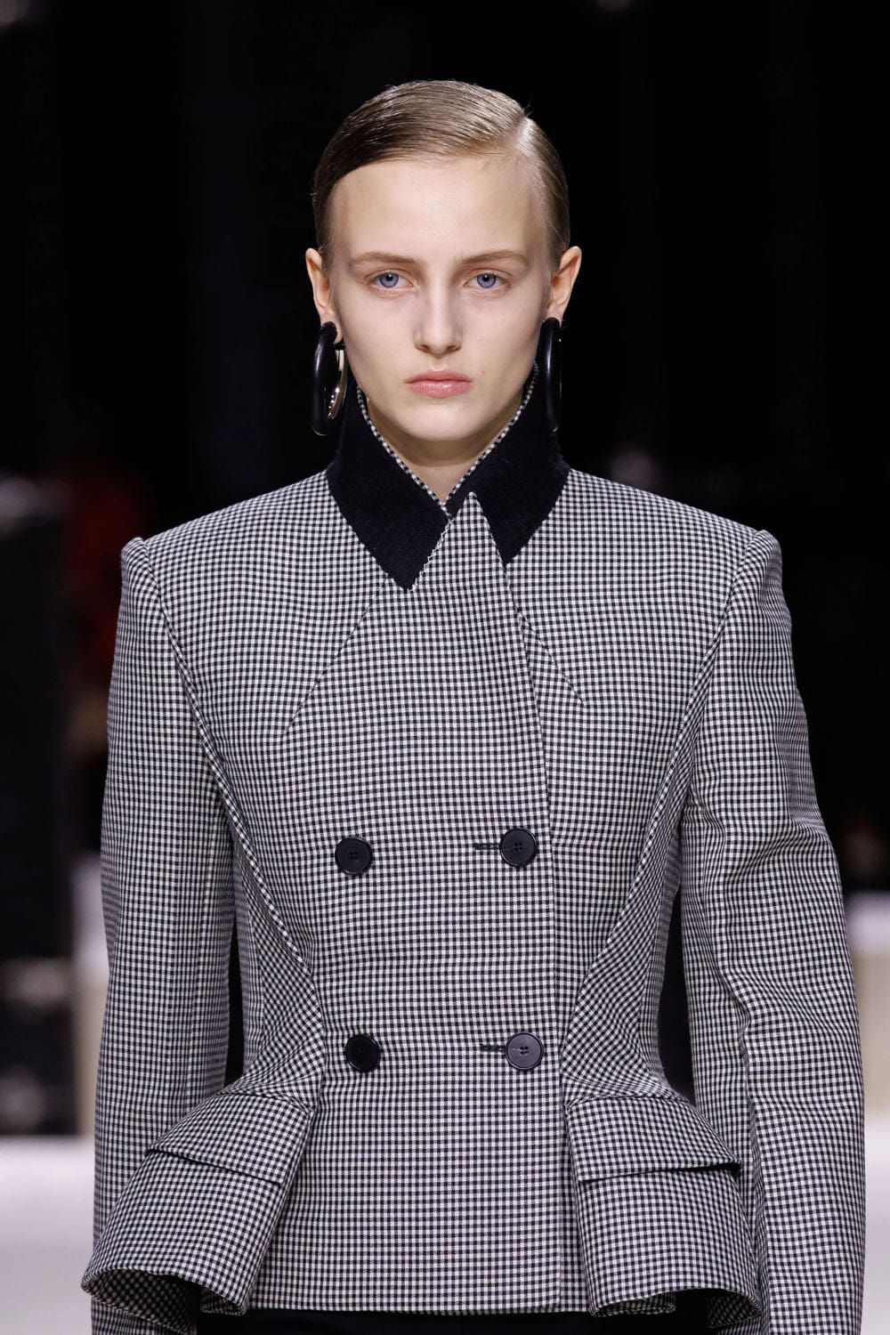 Questa interazione – rigore e sovversione – permeava la sartoria. Un abito grigio doppiopetto è stato completato da una singola cravatta di seta blu drappeggiata come un gesto più che come un accessorio, a metà tra Katharine Hepburn e il minimalismo anni Novanta. Poi, un'impeccabile giacca pied de poule, stretta e svasata sui fianchi, ha riaffermato la devozione della maison alla clessidra, ma con un'architettura più morbida: meno armatura, più intelligenza.