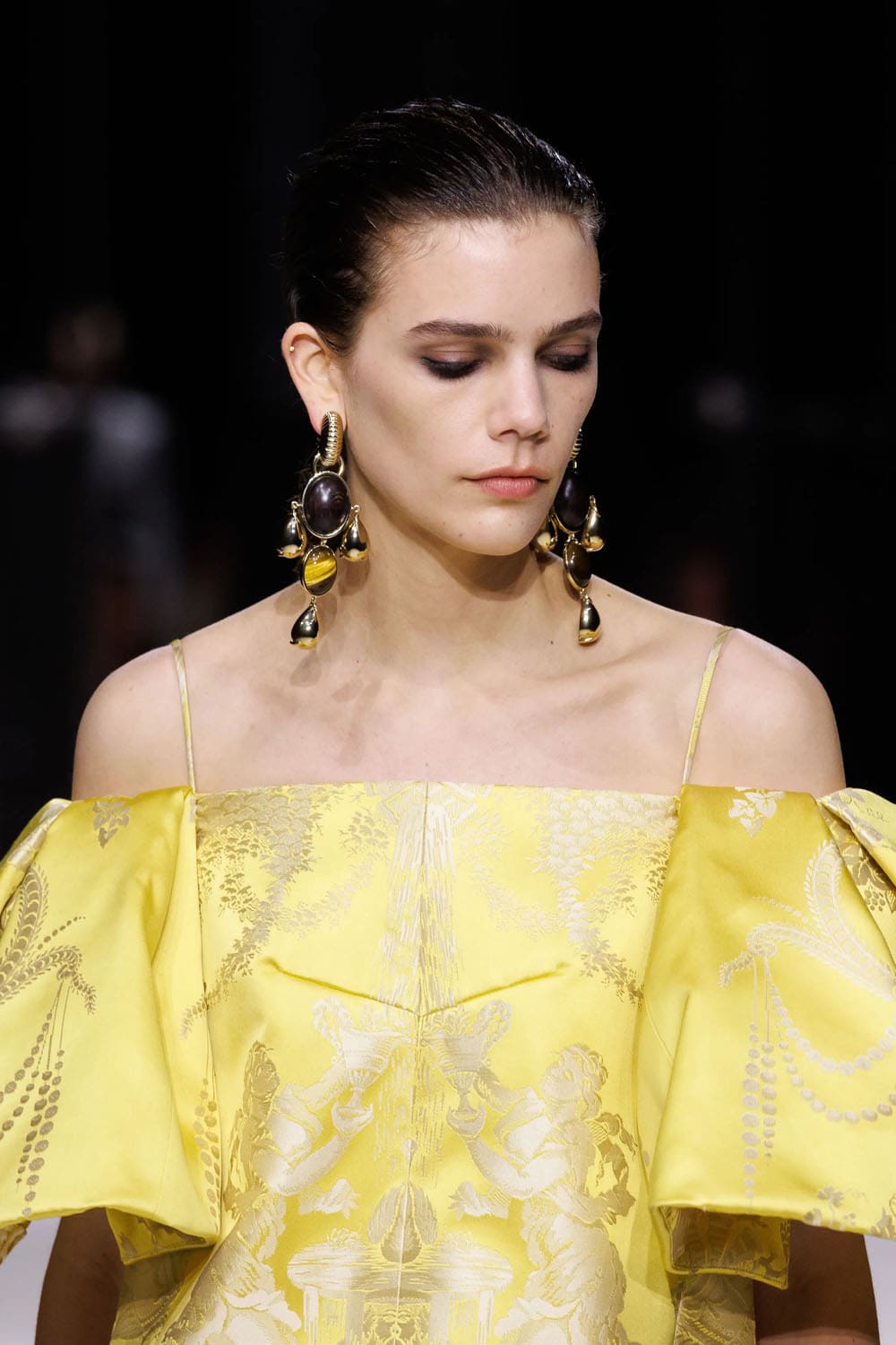 Un corto abito di broccato giallo, con maniche scolpite che lasciavano le spalle scoperte, sembrava uscito dal guardaroba fantasy di Hepburn, ma reso con una luminosità maliziosa che lo rendeva inconfondibilmente contemporaneo.