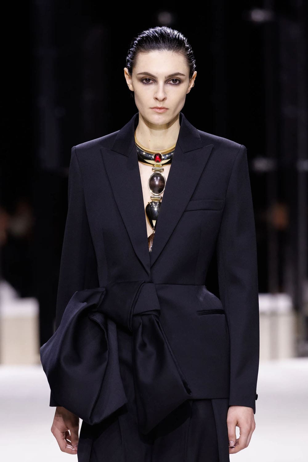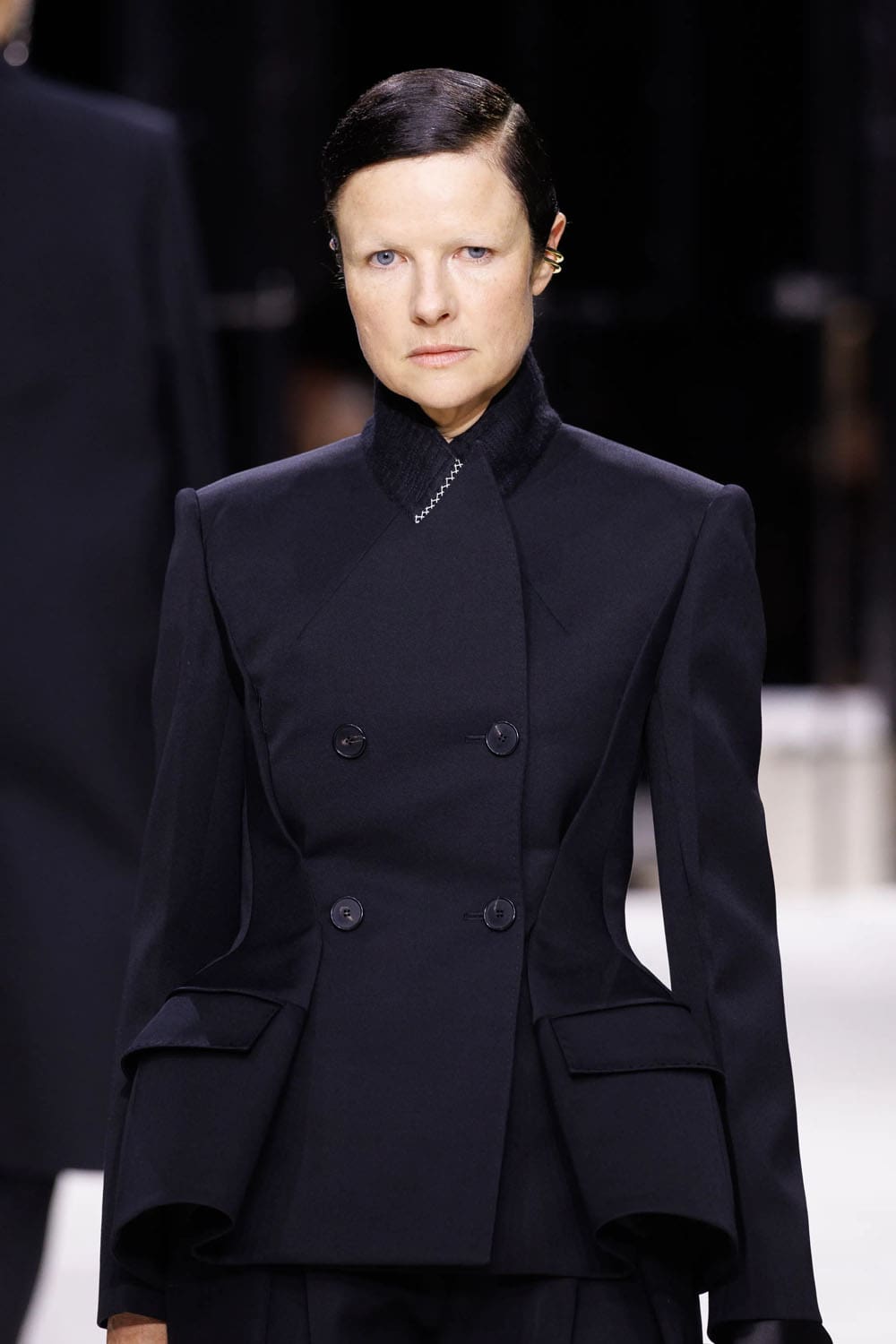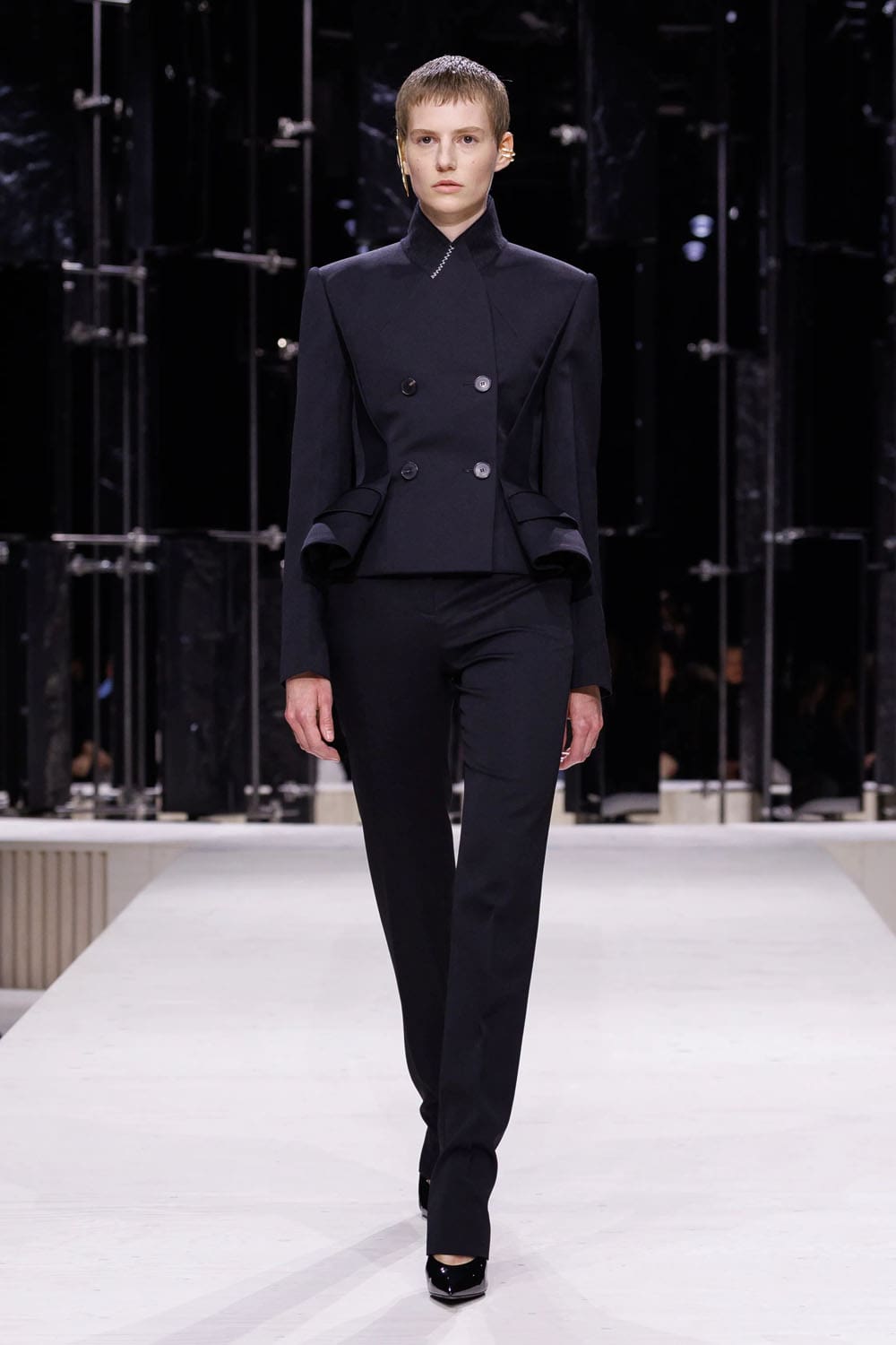 Gli abiti non erano uniformi; erano studi di personalità. I gessati maschili si ammorbidivano in pantaloni più ampi, mentre i tagli sinuosi introducevano fianchi con peplo, riecheggiando il rigore scultoreo che Burton ha perfezionato per decenni. E poi arrivò lo smoking: pulito, preciso e coronato da un cappotto da sera dal taglio così netto da tagliare praticamente l'aria dietro di sé.