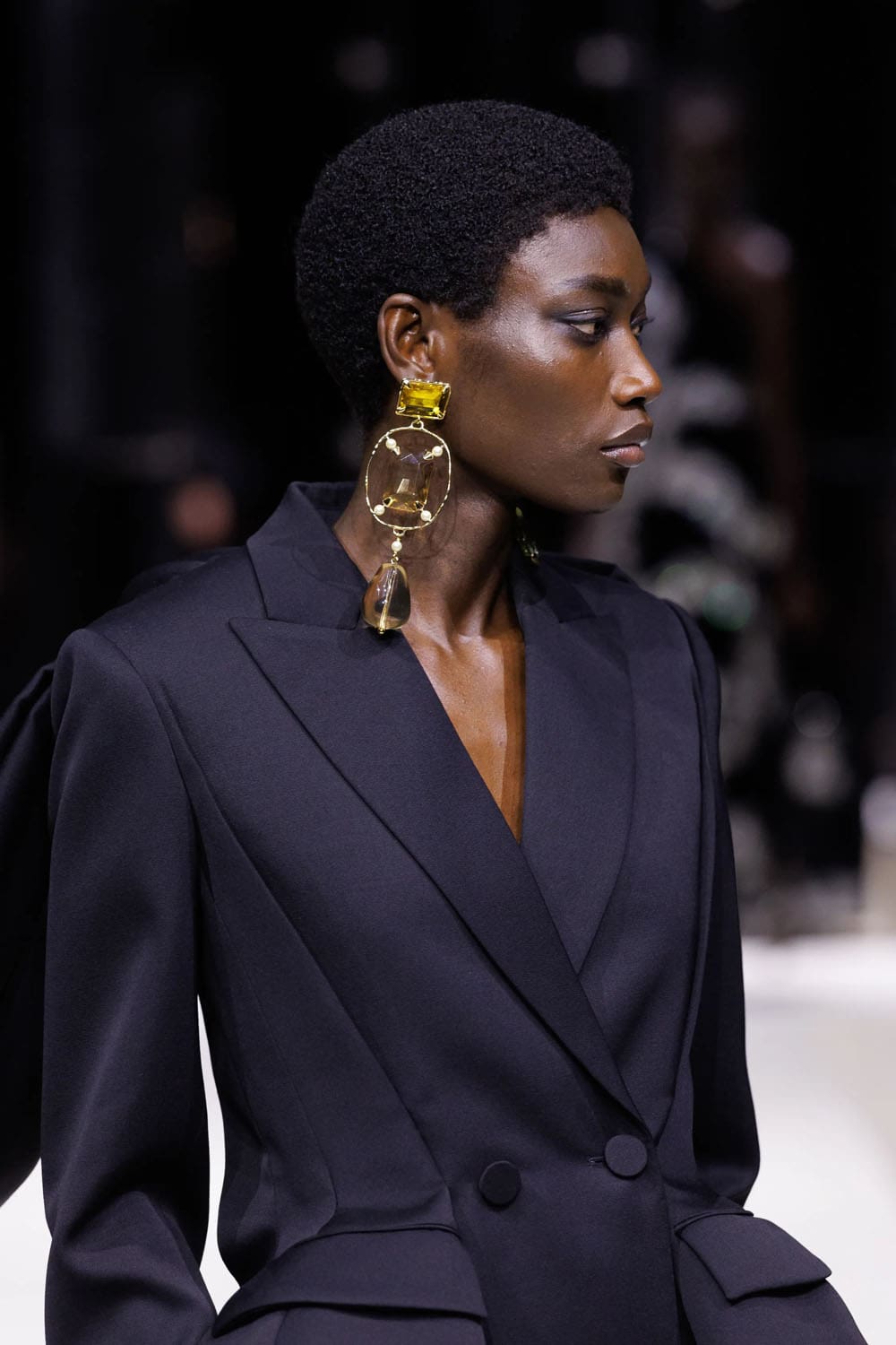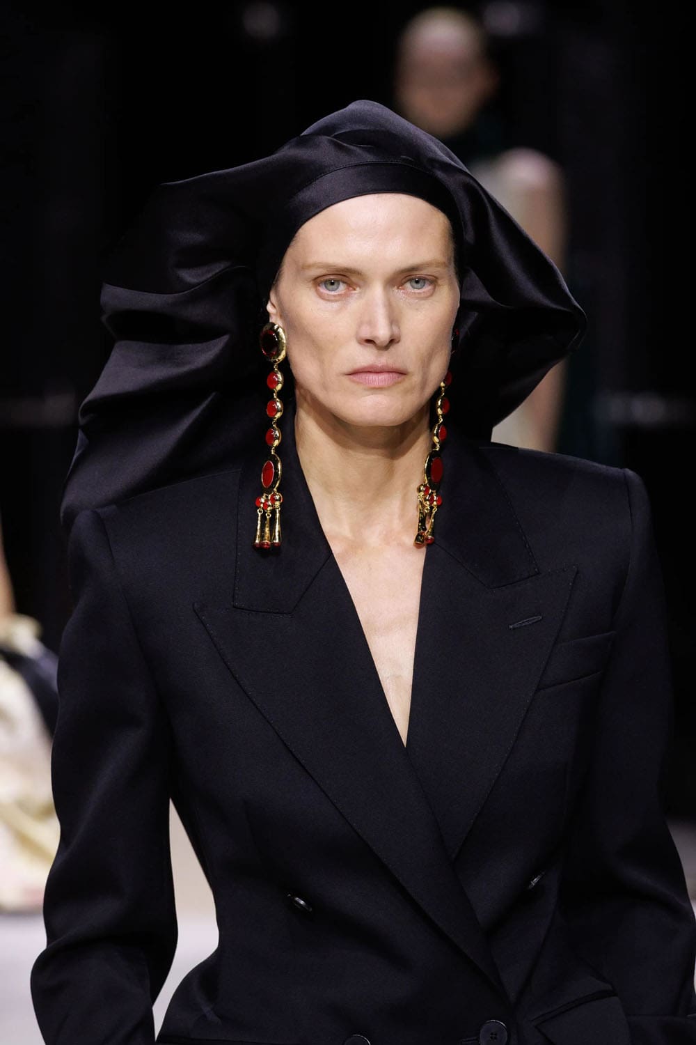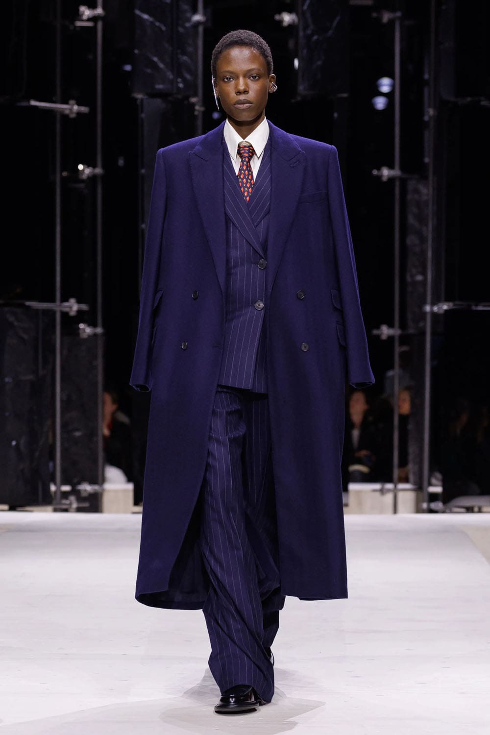 Gli abiti non erano uniformi; erano studi di personalità. I gessati maschili si ammorbidivano in pantaloni più ampi, mentre i tagli sinuosi introducevano fianchi con peplo, riecheggiando il rigore scultoreo che Burton ha perfezionato per decenni. E poi arrivò lo smoking: pulito, preciso e coronato da un cappotto da sera dal taglio così netto da tagliare praticamente l'aria dietro di sé.
