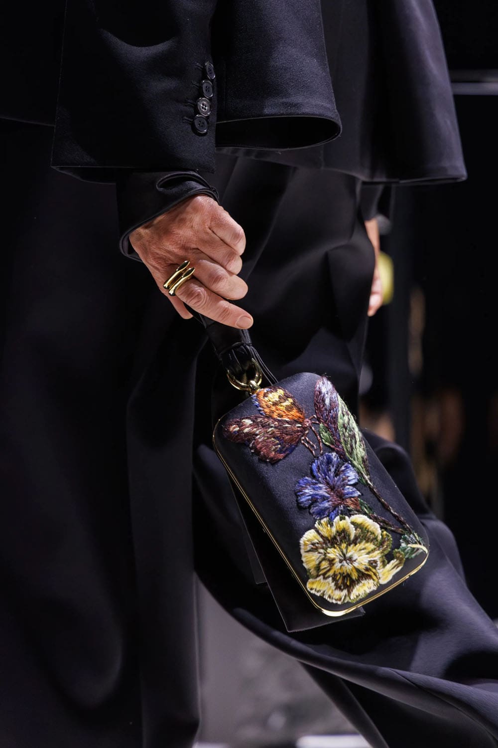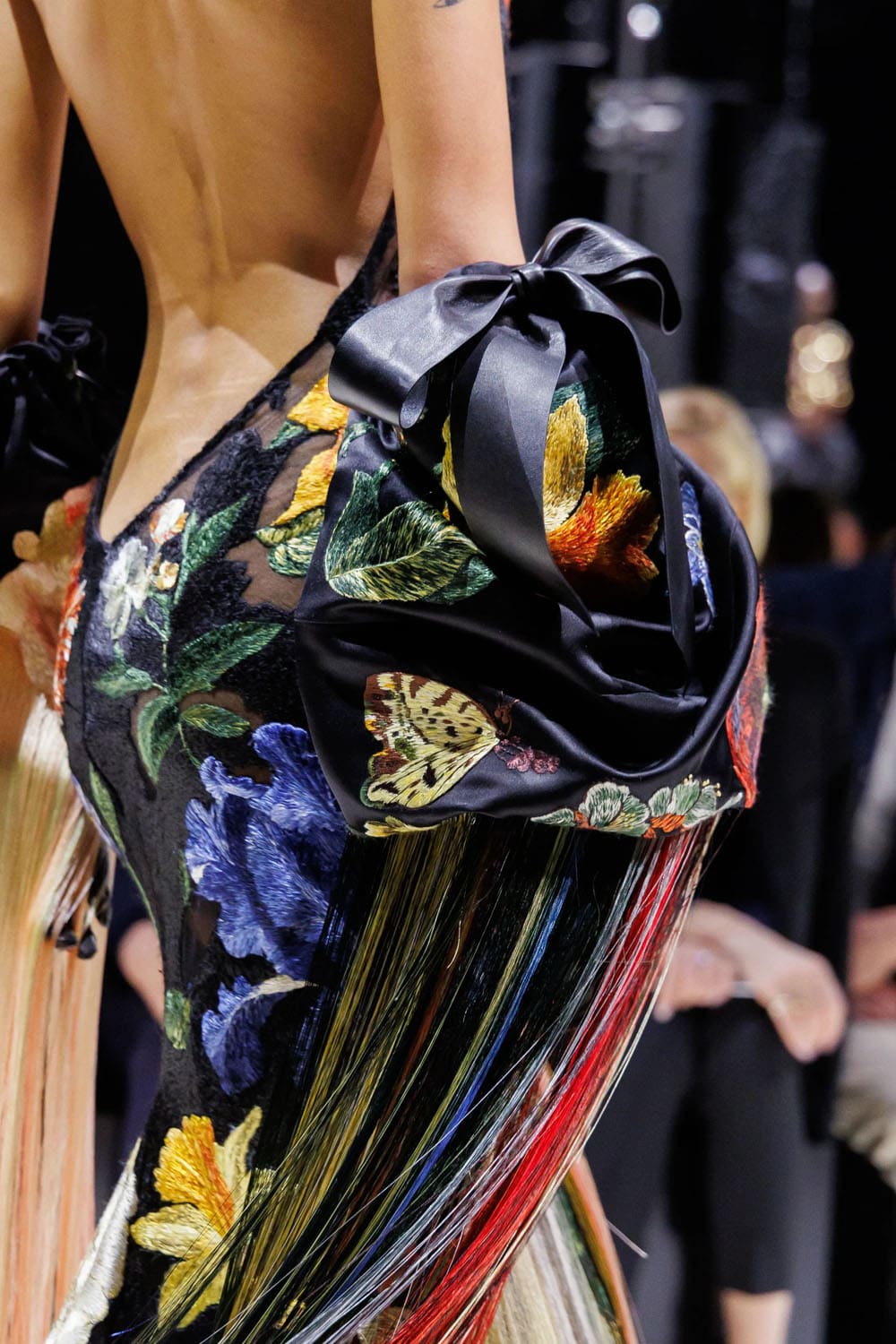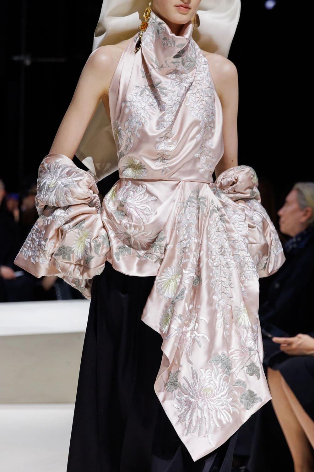 C'erano altri sussurri del genere: un top ricamato rosa pallido, raccolto in vita in pieghe scultoree e gonfie, indossato con austeri pantaloni neri; un abito a colonna nero sormontato da un enorme copricapo, a metà strada tra la ritrattistica medievale e la disciplina dell'alta moda parigina; stivali floreali dai colori vivaci ancorati a dettagli botanici degni di artemisia.