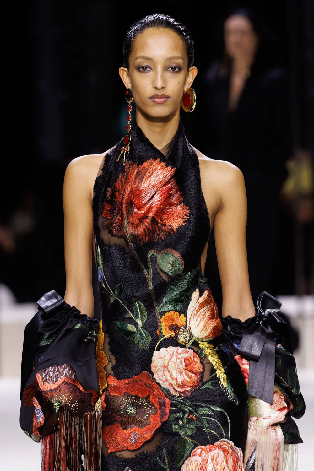 Un top rosso drappeggiato in velluto – intensamente sensuale, quasi ecclesiastico nel colore – abbinato a pantaloni ampi strutturati da cuciture intrecciate, dimostrava come Burton lavorasse il volume come narrazione, non come decorazione. Un abito da cocktail nero senza maniche ricamato con papaveri tentacolari e frange di seta svolazzanti suggeriva una sorta di giardino di mezzanotte, un'allucinazione couture ancorata a stivali con lo stesso tripudio floreale.