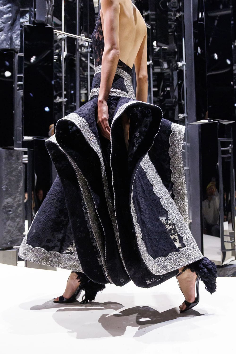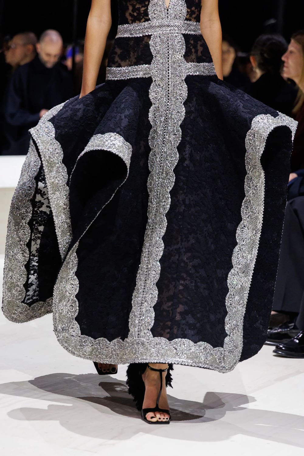 Uno dei tessuti da sera, un jacquard di seta giallo-bianco utilizzato per un abito con spalle scoperte, rimandava direttamente a un campione dell'archivio Givenchy di McQueen del 1996. Burton non ha messo in risalto la tradizione; l'ha inserita come un segreto di famiglia, visibile solo a chi sa leggere la cultura dell'alta moda.